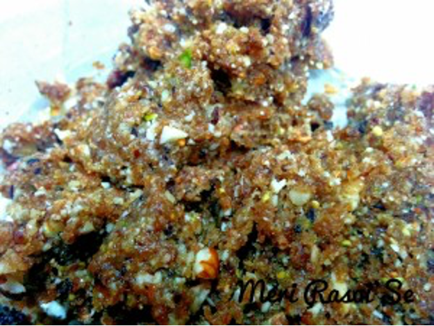 In the blender process the nuts to make a coarse powder . Because nuts release oil when they are ground so it is okay if it forms a lump . Keep aside.