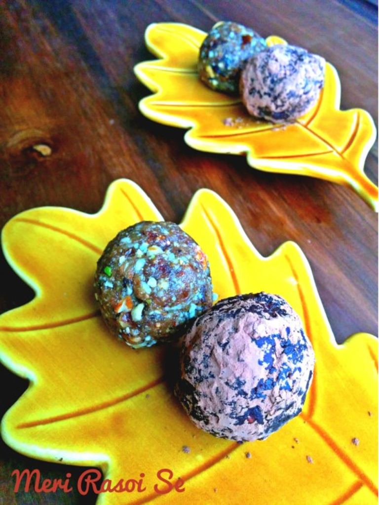 My kids who are actually not big fans of eating dry fruits and nuts, actually love these fruit and nut bites! This is a very easy and kid friendly recipe. My daughter had a great time helping me make these…from pitting the dates to shelling the pistachios and rolling the mixture into bite size morsels , not to forget rolling them in cocoa powder (which is totally optional). We rolled half of these in cocoa powder and the other half were left just like that. You can also roll them in finely chopped pistachios or desiccated coconut or just leave them like this.