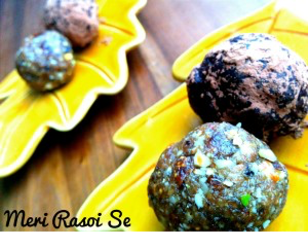 Eating dry fruit is not only an excellent way to satisfy the sweet tooth, but dry fruits and nuts are also a great source of minerals, proteins and fibre. Snacking on a moderate amount of dry fruits and nuts a day can keep you healthy and fit, but the key here is “moderate amount”. As they say that we eat with our eyes, it is very easy to overeat when it comes to eating dry fruits and nuts. Since Diwali just passed, chances are you have a lot of dry fruit in your house. Now you can either munch on it just like that or you can create something totally yummy with all those dry fruits. These fruit and nut bites are sinfully good and an excellent way to control the amount of dry fruit you eat. Since there is no added sugar in these bites, they are actually a much healthier and guilt free dessert.