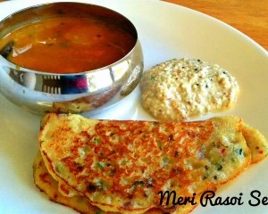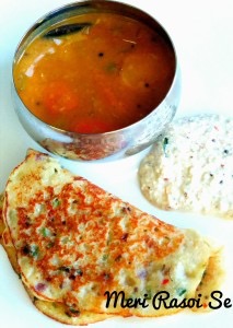 Dosa is a savoury South Indian crepe or pancake usually made with fermented rice and urad dal, stuffed with a variety of stuffings… tempered potatoes and onions being the most popular. Served hot and crisp, fresh off the griddle, it is one of the most popular South Indian dish. Cooking dosa requires a lot of prep work but the end result is a yummy crispy pan fried pancake that is just too hard to resist.